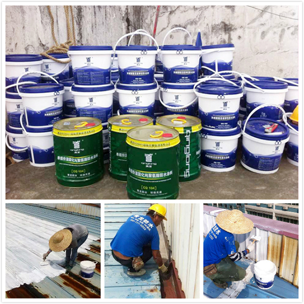 青龍公司中山經(jīng)銷商張總成功承接了這一防水補漏工程。經(jīng)過實地仔細檢查,并經(jīng)與客戶詳細協(xié)商,最后敲定采用青龍公司CQ103丙烯酸酯高級彈性防水涂料和CQ104單組份濕固化純聚氨酯防水涂料的組合補漏方案。青龍CQ103丙烯酸酯防水涂料具有良好的耐老化、延伸性、粘結(jié)性、成膜性及耐高溫性,因此非常適合在鐵皮房屋頂作整體涂刷;而屋頂排水溝則采用CQ104單組份濕固化純聚氨酯防水涂料。