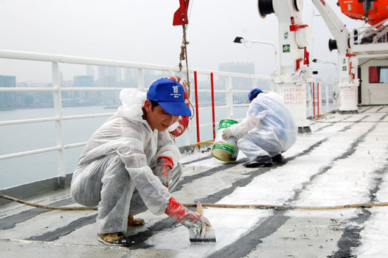 接到該訂單后,3月21日,公司派一支素質(zhì)過硬的施工隊伍奔赴香港開始作業(yè),由于期間香港天氣變化反復,時常下雨;待基面底漆頑固,銹跡斑斑難以清理,均為凹凸不平的麻面;再加上該郵輪白天需正常營業(yè),施工多只能在晚上進行,等等一系列因素都給施工帶來了嚴峻考驗。青龍公司歷來重視每一筆訂,注重每一個細節(jié),董事長宋敦清先生得知后,親自前往,與公司總工徐新生論證了一個較好方案后開始指導施工,考慮到施工部位特殊,長期在海面上風吹日曬,之后選用了其耐候、耐酸堿、耐紫外線、耐老化、耐霉菌、耐鹽霧、耐臭氧、耐溶劑、耐磨、耐沖擊和耐油性等綜合性能優(yōu)異的