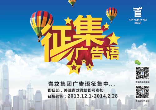 現(xiàn)為了使各地代理商、消費(fèi)者及社會公眾更加容易理解青龍集團(tuán)的環(huán)保節(jié)能、社會責(zé)任、誠實(shí)守信等文化涵義,建立青龍集團(tuán)全新品牌形象,現(xiàn)向社會各界征集集團(tuán)廣告語。歡迎社會各界踴躍參與。
