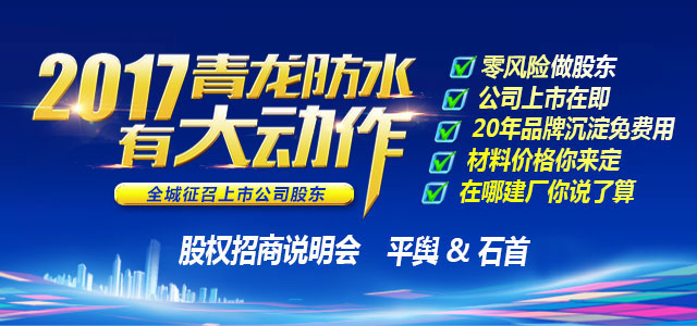 加盟青龍建材股份,20年防水品牌免費給你用,投資50萬,做上市公司股東!合作辦廠,防水材料價格你說了算!心動不如行動,選擇大于努力!