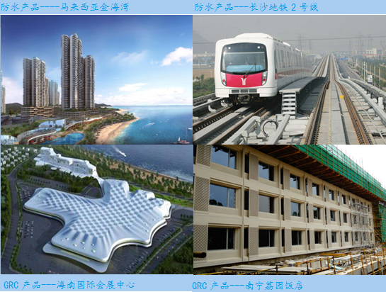 產(chǎn)品:各類防水卷材、防水涂料、剛性防水材料、密封堵漏材料、建筑加固補(bǔ)強(qiáng)材 料、保溫隔熱材料、干混砂漿、GRC/GRG歐式構(gòu)件等;