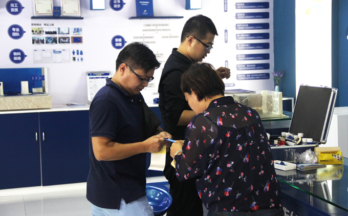 于總還通過(guò)家居防水模型等,介紹公司339定制防水系統(tǒng)優(yōu)勢(shì)及吸引力,以及特色防水維修補(bǔ)漏產(chǎn)品的使用。定制式的防水方案設(shè)計(jì),讓客人佩服的五體投地!