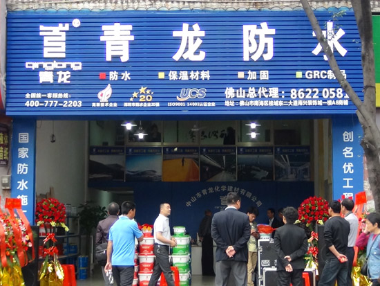 ?。翟拢慈眨殡S著喜慶的民樂,熱鬧的鑼鼓,位于佛山市南海區(qū)桂城東二大道南興裝飾城一樓A8商鋪的青龍防水佛山總代理專賣店隆重開業(yè)。經(jīng)過精心的裝修,藍底白字的“青龍防水”門牌顯得格外顯眼,而店前的花籃也為開業(yè)慶典增添了節(jié)日的氣氛。青龍建材集團董事長宋敦清、廣東省區(qū)域服務(wù)人員,以及一百多位防水業(yè)界嘉賓到場祝賀。