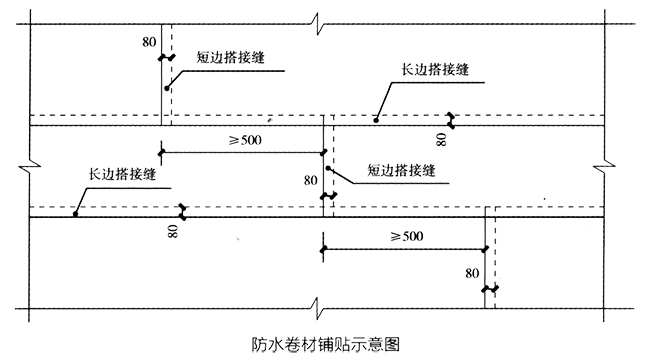 3、施工時(shí),相鄰兩幅卷材短邊搭接縫應(yīng)錯(cuò)開(kāi),且不得小于500mm,上下兩層卷材長(zhǎng)邊搭接縫應(yīng)錯(cuò)開(kāi),且不得小于幅寬的1/3。