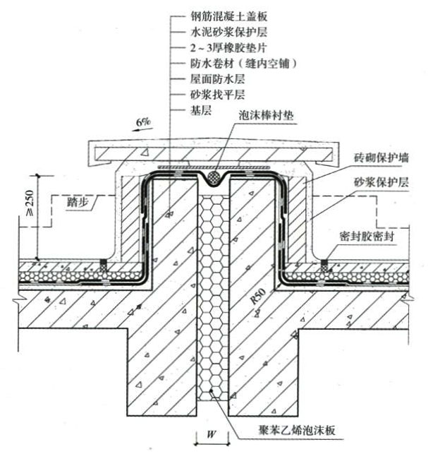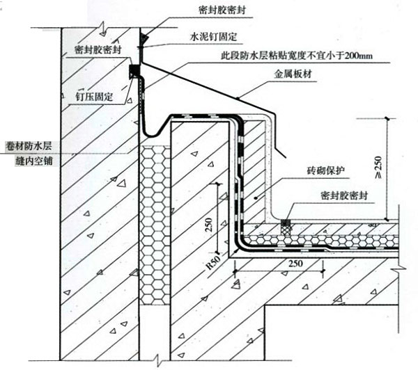 1.對變形縫的防水處理必須選用變形能力強及耐老化性能的合成高分子防水卷材,并應具備有效的密封構(gòu)造措施。 2.屋面變形縫應避免設(shè)計成平縫,變形縫墻應采用≥C20混凝土澆筑,不得采用磚砌。變形縫墻體宜與屋面結(jié)構(gòu)板一起澆搗,不留施工縫。如不能一次澆搗,應在墻體澆搗前施工縫位置嵌填5x8mm遇水膨脹密封膠。 3.在變形縫內(nèi)填背襯材料及彈性密封材料,對等高變形縫在墻頂鋪貼一條通長“U" 形防水卷材,寬度與墻面同,先貼好一面,縫中嵌入聚乙烯泡沫塑料棒作襯墊,再粘貼另一面,上面再蓋一層高分子卷材,并與防水層相連接粘牢,形成整體防水層。然后在變形縫頂部加鋼筋混凝土蓋板或金屬蓋板,混凝土蓋板接縫用密封膠嵌填密實。 4.對高低跨變形縫,則按“U"形方式鋪設(shè)卷材,卷材上方的收頭應塞入高跨墻體預留的凹槽內(nèi),用壓條或墊片釘壓固定,凹槽上部再用金屬披水板釘壓固定。卷材收頭及金屬板均用密封材料封嚴。 5.變形縫兩側(cè)防水層應滿粘,縱向搭接寬度不小于200mm并密封嚴密。 |