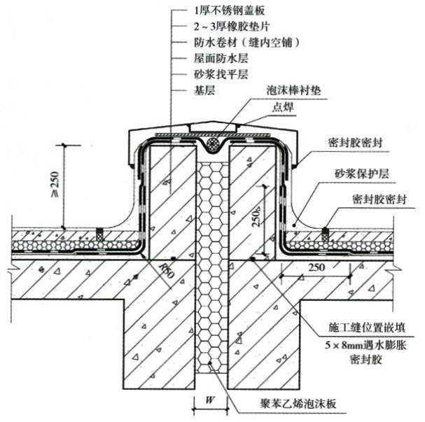 《屋面工程技術(shù)規(guī)范》 GB 50345-2012 4.11.18變形縫的防水構(gòu)造應符合下列規(guī)定: 1.變形縫泛水處的防水層應增設(shè)附加層,附加層在平面和立面的寬度不應小于250mm;防水層應鋪貼或刷至泛水墻的頂部。 2.變形縫內(nèi)應預填保溫材料,上部應采用防水卷材封蓋,并放置襯墊材料,再在其上干鋪一層卷材。 《屋面工程質(zhì)量驗收規(guī)范》 GB 50207-2012 8.6.5 等高變形縫頂部宜加扣混凝土或金屬蓋板?;炷辽w板的接縫應用密封材料封嚴;金屬蓋板應鋪釘牢固,搭接縫應順流水方向,并應做好防銹處理。 8.6.6 高低跨變形縫在高跨墻面上的防水卷材封蓋和金屬蓋板,應用金屬壓條釘壓固定,并應用密封材料封嚴 |