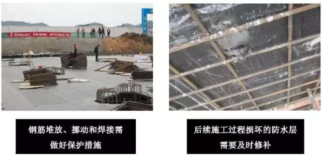 2、防水層施工后,鋼筋砼結(jié)構(gòu)底板施工前的相鄰工序,如支模板、捆扎鋼筋(焊) 等,需要相應(yīng)班組對防水層的實(shí)時(shí)、悉心保護(hù);
