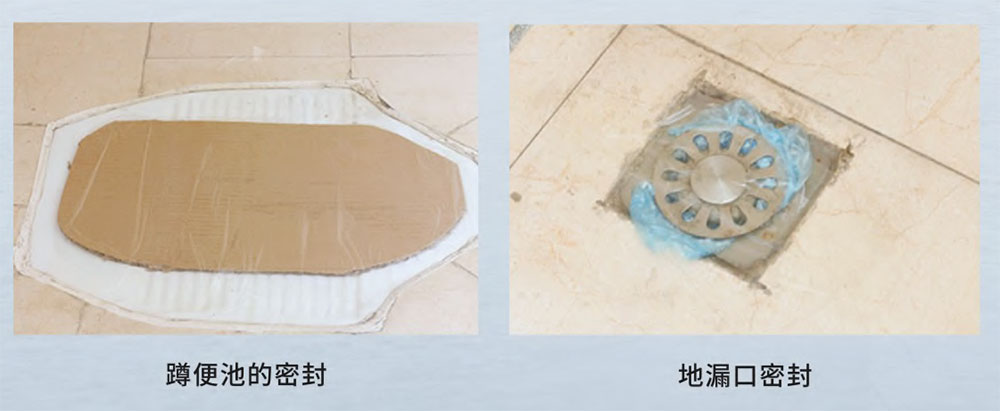 ②拿開地漏,用塑料袋堵住地漏,并用膠帶固定密封,直至保證水漏不下去為止,(必須先堵好地漏,以免材料凝膠后堵塞下水道)。如果大便器是蹲式的,需用紙板或泡沫板裁剪成與蹲便器大小相近的形狀并用膠帶固定密封,以防止?jié){液流入大便池后凝膠造成下水道堵塞。廚房衛(wèi)生間門口位置如果低于2厘米高的,請(qǐng)用泡沫板在門口做一道高3厘米的堤壩,防止材料流出。