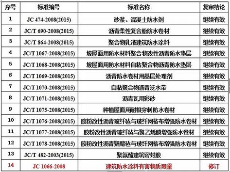 建筑防水行業(yè)中,《砂漿、混凝土防水劑》(JC 474-2008)等13項標準繼續(xù)有效,《建筑防水涂料有害物質(zhì)限量》(JC 1066-2008)1項標準予以修訂。詳情如下: