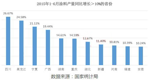 值得注意的是,中西部地區(qū)的防水涂料后勁十足,銷量大增。2015年上半年,四川省表現(xiàn)非常突出,其涂料總產(chǎn)量同比增長高達(dá)26.67%,涂料產(chǎn)量達(dá)到了56.21萬噸,位居第二梯隊之首,總排名第四。上半年四川省比去年同期增加涂料產(chǎn)量約15萬噸,新增產(chǎn)量相當(dāng)于北京市上半年涂料總產(chǎn)量8.6萬噸的1.74倍。排名第五和第六的分別為湖南49.20萬噸、山東45.63萬噸。下圖是2015年1-6月涂料產(chǎn)量同比增長>10%的省份。