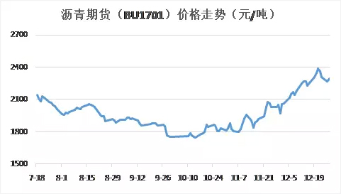 7月份之后,瀝青期貨價(jià)格一路下跌,至10月走穩(wěn)。11月上旬,受國際原油價(jià)格波動影響,瀝青期貨價(jià)格開始穩(wěn)步上升,從1830元/噸上漲至12月中旬的2386元/噸,漲幅達(dá)到30%。